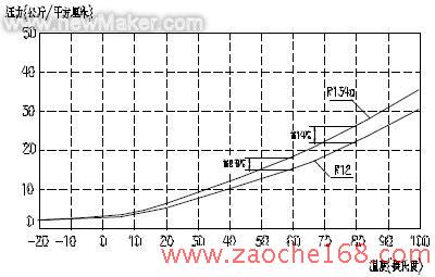 3) 饱和气密度小,导致压缩机排气质量流量小,若要达到于与R12 同样的流量,应选用较大型号压缩机;