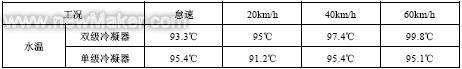 在1998 年6 月进行的环境模拟热室试验中,对两种冷凝器布置型式的空调系统进行了性能对比和对发动机水温的影响对比。结果示于表3。