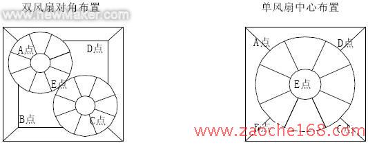 而用单风扇中心布置时,虽电机转速只有2000r/min,但冷凝器出风风速却比前者高,且各点风速相同,风量均匀通过冷凝器,效率非常高。
