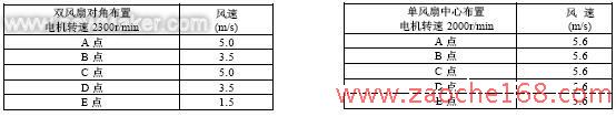 从以上数据分析,双风扇对角布置时,电机转速在2300r/min 时,冷凝器出风风速最大5.0m/s,最小1.5m/s,沿无电机对角线上的风速差别很大,风量不均造成风量的损失,导致电机及风扇效率大大降低。