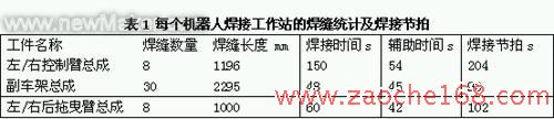 对于副车架总成的焊接,根据其焊缝的分布特点,采用双机器人同时对称施焊,可有效控制焊接时产生的扭曲变形。通过对三种工件总成焊接时焊缝数量、焊缝长度的统计,以及对焊缝分布特点的分析,结合机器人焊接的特点,为了满足单班制、251天,年产6万套/年的生产纲领,该机器人焊接生产线共由8套机器人焊接工作站组成。其中左右控制臂总成的焊接由4套单机器人焊接工作站完成,副车架总成的焊接由3套双机器人焊接工作站完成,左右后拖曳臂总成的焊接由一套双机器人焊接工作站完成。各机器人焊接工作站的焊缝数量及焊接节拍如表1所示。每个机器人焊接工作站都配置有焊枪清理器和一套头尾架焊接变位机,变位机可与机器人之间协调运动。