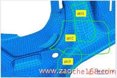 为了增加出现裂纹处的强度,在副车架上片Steering_rack_housing附近的三个区域进行了改动。三个区域(it01、it02、it03)局部处理见图3、4、5、6。调整后的三个网格形状运用HyperMorph的相关功能,将这些变动后的型面作为一个集合保存。