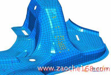 采用四边形单元和六面体单元划分有限元网格。副车架上下片之间的点焊采用点焊单元模拟,副车架上下片之间的缝焊采用四边形单元模拟。有限元模型见图1,Global Size: 5mm,共有33669节点,33165个单元。