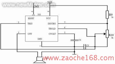 本设计采用第一种方法产生超声波,电路设计如图2所示。40kHz的超声波是利用555时基电路振荡产生的。其振荡频率计算式为f=1.43/((R 9+2·R 10)·C 5)。将R 10设计为可调电阻的目的是为了调节信号频率,使之与换能器的40kHz固有频率一致。为保证555时基具有足够的驱动能力,宜采用+12V电源。CNT为超声波发射控制信号,由单片机进行控制。
