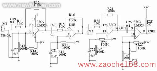 超声波在空气中传播时,其能量的衰减与距离成正比,即距离越近信号越强,距离越远信号越弱,通常在1mV~1V之间。当然,不同接收探头的输出信号强度存在差异。由于输入信号的范围较大,对放大电路的增益提出了两个要求:一是放大增益要大,以适应小信号时的需要;二是放大增益要能变化,以适应信号变化范围大的需要。另外,由于输入信号为正弦波,因此必须将放大电路设计成交流放大电路。为减少负电源的使用,放大电路采用单电源供电,信号放大和变换采用了一片LM324通用运算放大器,前三级为放大器设计,后一级为比较器设计。LM324既可以双电源工作,也可以单电源工作,因此能满足使用要求。为满足交流信号的需要,每一级的放大器均采用阻容电路进行电平偏移,即图3中的C7、C21、C22和C24,容量均为10μF,实现单电源条件下交流信号的放大。对于交流信号而言,电容为短路,因此前三级放大电路的增益均为10。距离较近时,两级放大的增益已能够输出足够强度的信号了,第三级有可能出现信号饱和,但距离较远时,必须采用三级放大。合理调节电位器R27,选择比较基准电压,可使测量更加准确和稳定。