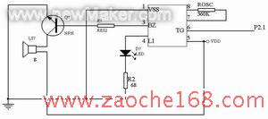 语音报警是指当倒车雷达探测到的距离小于所设定的安全值时,发出声音提醒驾驶员,语音电路设计如图4所示。M3720是单声一闪灯报警音效集成电路,芯片内存储一种报警音效,可直接驱动蜂鸣器发声或经外接功放三极管推动扬声器放音,同时还能驱动一只LED闪烁。该芯片各引脚功能为:5脚VDD;1脚VSS分别为电源输入端与负端,VDD电压3~3.5V;8脚X和1脚Y分别为芯片外接振荡电阻器;6脚TG为触发控制端,低电平触发有效;3脚BZ和2脚BB分别为报警音效输出端,可直接外接压电陶瓷蜂鸣器,如果驱动扬声器则由3脚BZ端引出;4脚L为闪灯输出端,可直接驱动LED发光。