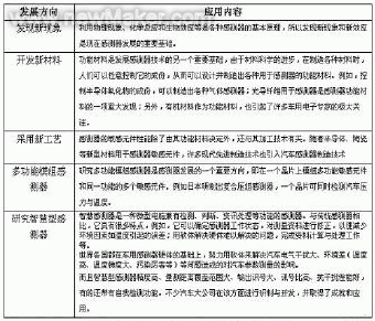 现代汽车上微机电技术发展的车用传感器发展趋势应朝多功能化、模块化、智能化、微型化技术方向发展。