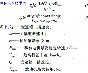 对于变速器的速比设计要满足最高车速和最大爬坡角要求,变速器两挡速比要满足下面两式,即: