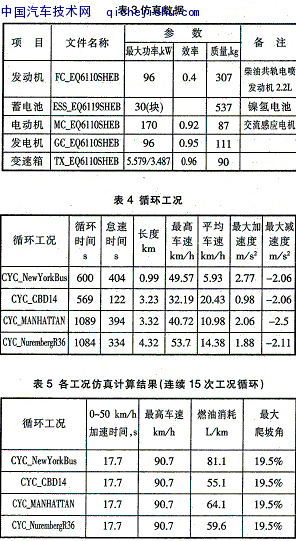 对于仿真使用的公路循环工况,由于针对我国城市道路及城市客车行驶状况数据有限,参考相关数据和仿真软件中已有的城市公交循环工况,采用美国纽约公交循环工况、中心商业区循环工况、美国纽约曼哈顿循环工况和德国纽伦堡36路公交车运行工况进行仿真计算,各工况数据见表4,仿真结果见表5,混合动力汽车与传统汽车数据比较见表6。