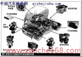 通过ESC控制模块不断监测并计算车辆的横摆角,并与安装在转向管柱内的转向角度传感器测得的转向盘的转向角度相比较,当两者差异超出限制的数值时,通过ABS电控单元激活安装在前桥的ABS电磁阀对转向轮进行制动,以纠正车辆转向不足或者转向过度的情况,从而让车辆在低附着系数路面上提高操纵稳定性。另外在制动的工况下,制动回路中增加的压力传感器使系统能精确的获得制动压力输出的大小,从而实现更精确的制动控制(见图8)。图9为ESC控制模块和横摆角传感器。