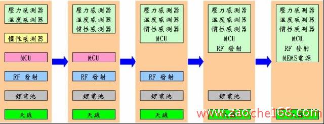 发展TPMS主要考量有:低功耗、配重(牵涉使用组件数量的多寡及体积)、成本。功耗跟电池使用寿命有绝对关系;而配重则牵涉到TPMS发射模块的安装。故TPMS设计方案的发展也依此考量为蓝图(请参考下图)。为降低功耗,设计趋势第一步走向内建惯性传感器,侦测到车辆移动才唤醒发射模块藉以节省电能,最终目标走向无电源模块,即内建MEMS电源以提供电能。至于配重及成本,整合型芯片为设计趋势。整合胎压传感器与MCU,再将RF发射也包含进来,至最后将MEMS也设计在一起,不但可减小模块体积,也节省成本提高市场竞争性。