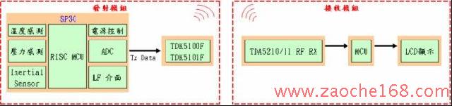 发射模块由胎压传感器MPXY80xx及内含射频发射的微控制器MC68HC908RF2组成,MPXY80xx工作在2.1-3.6V,具有低功耗的效能以延长电池寿命。并整合MCUwake-uptimer与自身的低频震荡器。此外,其输出为8bit数字输出,并已经与MC68HC908RF2完成接口最佳化。接收模块主要由射频接收芯片MC33594及微控制器MC68HC908GT8及相关的外围线路组成。接收灵敏度为90dBm,因为讯号发射时间很短,加上每个发射单元都有其独特ID,就由此可减少汽车EMI的干扰影响。