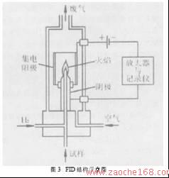 氢火焰离子化分析仪(FID,Flame Ionization Detector)是用来测定内燃机排气中未燃碳氢化合物浓度的仪器之一。由于氢气与空气燃烧离子化作用非常小,但如果将有机碳氢化合物导入氢火焰中,在氢火焰的高温(2000℃)作用下,部分分子和原子就会离子化生成大量的自由离子,离子化的程度与碳氢化合物分子中碳原子数成正比关系。FID就是通过以上现象,外加适当电场,使自由离子形成离子电流并产生微电流信号,那么通过测量离子电流的大小即可确定试样气中碳氢化合物以碳原子计量的浓度。图3所示的就是FID结构示意图。