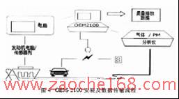 OEM-2100单元由5个主要的子系统构成:电脑、轻型车扫描器、重型车扫描器、微粒物监控器及双重气体分析仪。此外,还有几个可选择的设备,包括全球定位系统(GPS)、预先催化取样器、加热取样管、重型发动机扫描仪和通用传感器列,这些设备根据测试需要,进行选择性的安装。图4所示的是OEM-2100系统安装和数据传输的示意图。