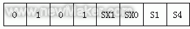 防扒车模式下,输出的数据包也包括3个字节,但只有第一个字节为有效数据,后两个字节无效,固定为‘0x00’。该数据包第一字节的数据格式如图6所示,高四位为起始标志,用于说明此报警数据是倒车模式下的数据还是防扒车模式下的数据,倒车模式是“0101”,扒车模式是“1010”。低四位指示方位,SX位为1则表示X号探头检测到近距离障碍物,SX为0则表示没有检测到近距离障碍物。