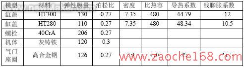 缸盖材料在更改前后分别为HT300和HT280,螺栓为合金钢40CrA,气门座圈材料为高合金钢,机体材料为灰铸铁,在温度、热—机械应力计算中需要材料的弹性膜量、泊松比、密度、比热容、导热系数、线膨胀系数等各种参数,在本次计算中所采用的材料及其各自的参数如表2。