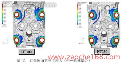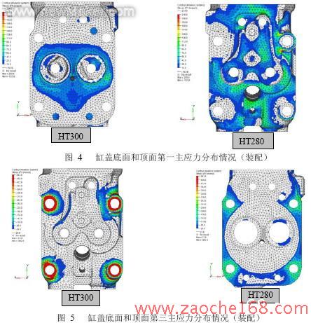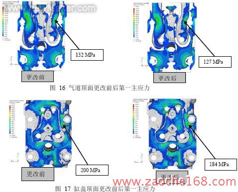 (2)采用HT280之后,缸盖大多数关键面上的第一主应力数值均有不同程度的下降。