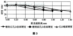 齿轮在渗碳炉中及淬火过程中的装央及分布将导致工件畸变和硬度不够,除了淬火介质的温度是影响畸变的因素外,齿轮冷却时周边冷却速度是否一致是另一重要因素。通过试验一解剖一检测一再试验,掌握了其变化规律。试验表明,在同一渗碳层条件下,不同的淬火条件会明显地影响有效硬化层深度。为此,改变了渗碳装炉方式,以保证渗碳时气氛畅通和淬火时冷却均匀,增加渗碳淬火有效硬化层深度,使有效硬化层深度从0. 25- 0. 3 5mm增加至 0. 6- 0. 7mm;适当减少了渗碳淬火后的磨削余量,将磨削加工余量从 0. 20- 0. 3 5mm降至 0. 15- 0.30mm;降低了磨削速度,使装工件的主轴转速从 160r/min降至 70r/min;提高了冷却能力,防止磨削过程过热。上述措施保证磨削后孔D表面硬度达到要求,详见图3。