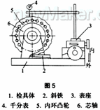 以检测20个平面的尺寸H及位置度公差(0. 015mm),是一种对中心轴线等距而均匀错开平面间的尺寸要求,要进行技术测量是比较困难的。通常的检测方法是用三座标测量机进行抽检,但成本高,效率低,不能满足生产检验需要。为了既保证检验质量,又能满足全检需要,我们采用综合性的直接相对量法,设计了一套内凸轮检测工具。经使用验证,该检具能测量内环凸轮ZH的公差,并具有精度高。生产率高、劳动强度小、要求的测量技术水平也不高等特点。检测工具主要结构见图5,工件孔D被小锥度芯轴(1:3000)定位并由斜铁楔紧,安装在两个固定顶尖上,芯轴具有ZH精度的外圆柱面,专用表座可沿导轨作径向和轴向移动,从千分表上可读出被量平面与ZH精度的圆柱面最高母线的差值,该差值可以作为判断尺寸H的依据。