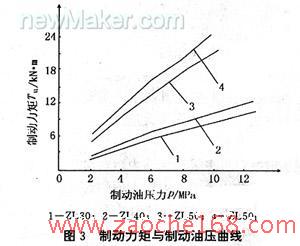 由图3可知,对于单钳制动器(如ZL40型),油压增大时制动力矩增加缓慢。对于双钳制动器(如ZL50型) 制动力矩随制动油压增高时,制动力矩快速增加,但各机型的制动力矩都呈线性增长。