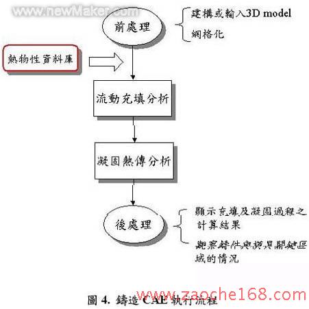 铸造CAE软件分析的流程如图4所示,与一般我们所熟悉的CAE流程大致相同,其中最重要的是热物性数据库的输入。热物性数据库包含各种材料的热物理特性数据,如密度、比热、热传导系数、潜热、固液相线温度、接口热组抗、黏滞系数、表面张力等以及制程参数。热物性数据库的数据直接影响到流动充填分析与凝固热传分析的正确性,因此热物性数据库数据的准确性与数据库中是否有我们所使用的材料便需要加以注意。