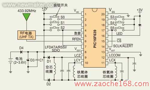图2为PKE应答器的配置示例。这个应答器包括PIC16F639器件、外部LC谐振电路、按钮、UHF发送器、后备电池(可选)和3V锂电池。