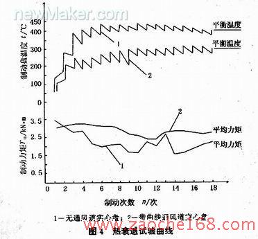 在连续制动过程中,随着制动温度升高,摩擦衬片的摩擦系数降低,制动力矩下降或不稳定(称热衰退)。制动时,制动器温度常在300℃以上,有时高达600℃~700℃。制动盘温度升高使摩擦材料表面产生热分解化学反应, 而且加快了摩擦衬片的磨损。几种制动器热衰退试验情况见图4。