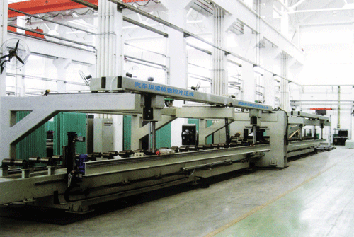由于不同车型底盘上的配置不同而使得底盘纵梁的形状、尺寸及孔的数量、大小及分布亦会不同,因此车型的多样化以及发动机等核心零部件的更新换代等变化都对底盘厂家产生影响。直到20世纪80年代中期,大批量生产的专业制造厂家主要还是靠大吨位压力机一次冲压成形。这种大型压力机的投资巨大,而针对一种车形的一套冲压成型模具从设计到生产,周期很长,一般要半年以上,制造成本也很昂贵,在新车型的试制过程中会大大增加产品开发的成本和风险。而中小型汽车生产厂家就只能靠使用摇臂钻床划线靠模来完成,不仅劳动生产率低,而且精度差,劳动强度极大。激烈的市场竞争,对汽车生产设备提出了更高的要求,于是,一种新型高精度、高效率的纵梁数控加工设备应运而生,这就是汽车纵梁数控冲孔生产线。