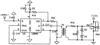 图3为“多谐振荡器+高频脉冲变压器”组成的驱动电路,其中由555构成的多谐振荡器的工作频率为f=1.43/(R18+2R22)/C19。在该电路中,检测与互锁电路控制着555集成块的引脚4。当引脚4为高电平时,即检测电路检测到系统应该进入能量回馈状态,多谐振荡器开始向Sd输出开关脉冲;当引脚4为低电平时,系统处于电动运行状态下,多谐振荡器不向Sd输出开关脉冲。