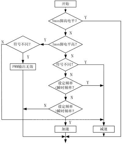 本系统采用SA866AE/AM芯片的VMON和IMON两个引脚进行加减速控制,控制流程如图5所示。①如果VMON有效(即VMON≥0.5VDD),则加减速指令无效,该条件具有最高优先,它可防止过度减速时再生能量通过功率管而导致过电压。通常VMON<0.5VDD时,可以进行加减速调节。②如果IMON有效,无论UP、DOWN处于什么状态,瞬时频率都会被降低到预先设置的减速频率水平上,若在瞬时频率降到0时,IMON≥VDD,则PWM脉冲输出截止,此时不能进行任何加减速操作。该条件的优先权比VMON低,它可以防止加速过高导致过流过热损坏开关管。③当上述二者都无效时,运算法则将综合比较器的输出逻辑、DIR引脚控制和计数器信号,一起得出最后的调速控制。