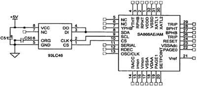 SA866AE/AM的串行三线接口可与256位或1024位的串行EEPROM连接,如93C06或93C46。所有的参数存储在EEPROM中,复位以后通过串行接口自动下载。本系统拟采用93LC46进行参数存储,与SA866AE/AM的接口如图6所示。