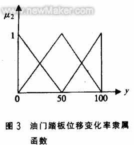 首先根据采集到的油门踏板位移值及其变化率,将它们分别模糊量化。模糊量化就是将精确的数字量转换为模糊量,即将输入的精确量转变成为与之相应的隶属函数。隶属函数有钟形,梯形,三角形等形状,一般认为钟形最好,但难于计算;三角形次之,最后是梯形。在这里中,为了计算方便,选用的是三角形隶属函数。油门踏板位移及其变化率的隶属函数如图2、图3所示。