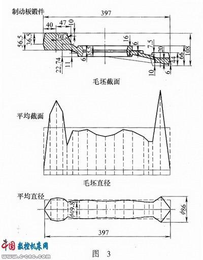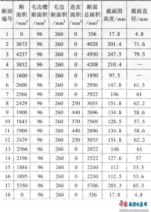 (4)绘制计算毛坯的截面图和直径图 从制动板锻件上,选取18个典型断面,经计算、测绘得出如附表所示的截面数据。为了绘制毛坯的截面图,把锻件各断面总面积换算成高度,进而计算出截面直径。