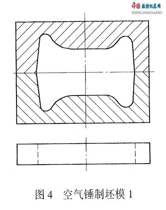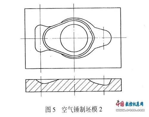 (3)制坯 制坯在750kg空气锤上自由锻制坯。工步复杂,且此工序极为关键,要求分料准确,制坯胎模模具设计精确,不能墨守成规。经过反复探索,确定两套成形胎模和一套冲孔胎模锻造、冲孔,两套成形胎模形状见图4、图5。
