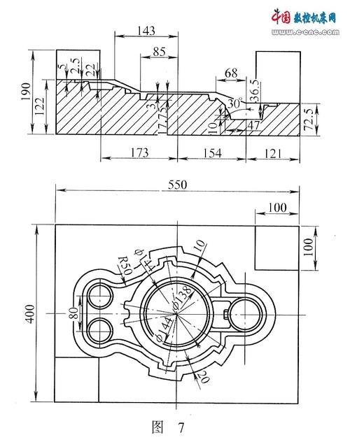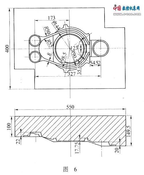 (1)成形模 锻模传递动力,迫使金属毛坯成形,承受反复瞬时冲击载荷和冷热交变作用,工作条件繁重,产生应力大。制动板锻件有三个分模面及斜面,模锻过程中易产生水平分力,引起锻模错移,使用对角锁扣来平衡水平错移力。按l%的冷缩率设计模具,采用螺栓、压板紧固。模具采用5CrMnMo材料制造,模具热处理淬火硬度42~46HRC。鉴于制动板零件的低价战略,模具制造时,最大限度地采用车、铣、钻、刨和磨这些低成本普通机加工方法和钳工修磨方法,极少部分采用了电火花加工方法。同时制造两套模具,便于维修更换,不影响生产。模具维修也采用氩弧填焊的方法,做好细节降低成本。成形模形状尺寸见图6、图7。