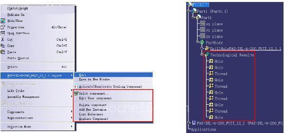 下面右图所示可以让我们在CATIA 加工模块中提取自动布尔运算生成的螺钉孔及柱销孔的加工信息,从而生成这些孔的NC 加工程序。
