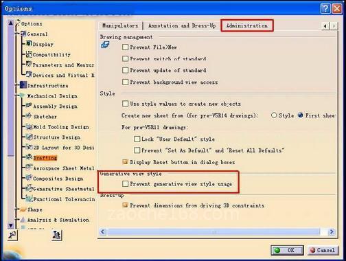 首先需要制作一个名称为WorkOnSupport3DCustumizedStyle xml 文件放置在\intel_a\resources\standard\generativeparameters 目录下, 对此功能提供支持; Options\Drafting\Administration 页面下“Prevent generative view style usage”选项(如图)取消,激活这项功能。