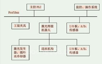 我公司采用的激光钎焊系统由主控PLC、激光焊接机器人、工装夹具、激监控系统、激光发生器、循环水冷却器和送丝机构等组成(见图2),其中主控PLC负责与激光焊接机器人、工装夹具之间的通信及协调配合及整个系统的安全保护,机器人则主控激光发生器、循环水冷却器、送丝机构之间的通信、协同工作。