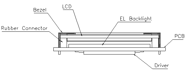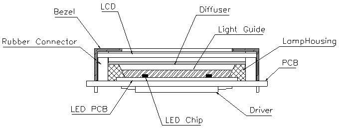 背光源可以使用 CCFL(冷阴机荧光灯), EL(场致发光器)和 LED(发光二极管)等可见光源。下面是带背光源的液晶显示模块的结构示意图。