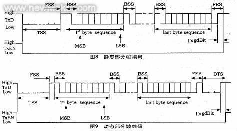 将这些序列与有效数据位(从最大位MSB到最小位LSB)“组装”起来就是编码过程,最终形成能够在网络传播的数据位流。此外,低电平的最小持续时间为一个gdBit。图8与图9分别为静态和动态部分的帧编码。