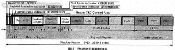 一个数据帧由帧头(HeaderSegment)、有效数据(PayloadSegment)和帧尾(TrailerSegment)多个部分组成。FlexRay数据帧格式如图12所示。