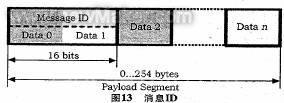 在动态时序部分,有效数据部分的头两个字节通常用作消息识别域(messageIDfield)。消息识别(又叫消息ID)标明应.用数据的物理内容,仅仅用于在动态时序传输的数据帧,长度为16位。在传输节点中,消息ID是由主机将其作为应用数据而写入的,通讯控制器(CC)并不能够对消息ID进行识别。在接收节点中,对一个帧的存储依靠于利用消息ID而进行过滤处理的结果,如图13所示。