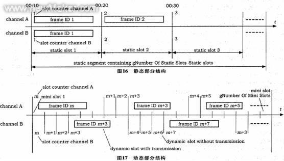 采用的是基于最小时间片的时序,由若干个最小时间片组成,最小时间片的长度都相等。帧的长度是可变的,而且与静态部分相比,动态部分的两个时间片计数器是独立计数的,在不传输数据帧时,计数器以minislot为周期进行加1计数,在传输数据帧时计数器不工作。两个通讯通道不必同步。一个动态时间片(Dynamicslot)包含一个或多个minislot。如图17所示。