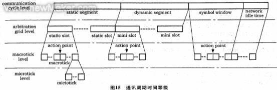 在1个通讯周期内,有4个时间等级(timing hierarchy),从最低层到最高层分别是:最小时间节拍层(microtick)、最大时间节拍层(macrotick)、仲裁网格层(arbitrationgrid)和通讯周期层。如图15所示。