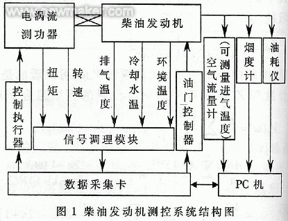 测功能即为德国SCHENCK公司的W40型电涡流测功器,可测发动机最大功率40kW。测耗仪是自动设计的,利用电子天平称量燃油消耗量,通过RS232C(25芯接插件)与PC机连接。可烟度计和空气流量计均为第三方仪器,通过RS232C(9芯接插件)与PC机连接。