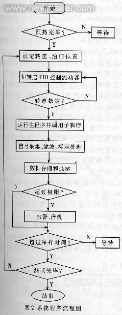 根据流程需要,编写了温度测试子程序和速度判断子程序,用于监控温度和速度状态。对于速度,用磁电和光电转速传感器同时测量,程序中设采样频率为5000Hz,采样数为5000,每秒显示、记录一个点,每8个点取一次平均,判断平均值误差是否在设定范围内而且持续一分钟以上。