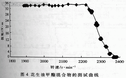 本系统对柴油和十六种植物油的燃烧性能进行了连续一个月的测试。试验过程中,保证上止点前32°的喷油提前角不变和油门全开。在发动机工作转速范围内,通过控制测功器改变发动机转速进行测量,从2375r·min-1开始降到2250r·min-1,间隔为25r·min-1。其中,扭矩、转速、温度、油耗、空气流量量每秒采一个点,而排气烟度一分钟采用三个点。在工况稳定一分钟后,连续采样一分钟以上,每个样品试验重复三次,并测试最大扭矩点的情况。图4所示为花生油甲酯混合物的测试曲线。