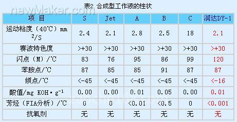 2、合成型(或半合成型)电火花加工液(放电加工油,电火花机油)。由于矿物油放电加工时,对人体健康有影响。随着数控成型机数量的增多,加工对象的精度、表面粗糙度、加工生产率都在提高,因此,对工作液的要求也日益提高。到了80年代,开始有了合成型油,主要指正构烷烃和异构烷烃。由于不加酚类抗氧剂,因此,油颜色水白透亮,几乎不含芳烃,几乎没有异味。然而,我们国内80年代曾进行过合成型碳氢化合物——电火花加工液(放电加工油,电火花机油)的研制,由于产量低、成本高,只供少数科研,军工单位使用。我们的市场已被国外的产品占有了相当一大群客户。目前,我国三家大的生产厂商,已完全有能力生产这一部分油,而且价格低廉。缺点是合成型油不含芳烃,故加工速度稍低于矿物油型的电火花加工液(放电加工油,电火花机油),已如表2所示