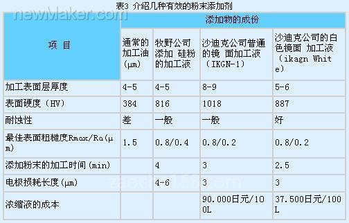 2 操作工艺的改进,加入混粉的工艺方法。首次尝试的,最成功的应是日本石油公司同日本Sodick、牧野等厂商的结合,生产出一些混合粉末。如硅粉、铬粉、白色粉末等。粉末的特点: