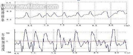 车轮的加、减速度和滑移率的门限值的确定是一个反复交替验证过程。方法为:计算车轮的加、减速度和参考滑移率,以参考滑移率为控制参数初步确定车轮的加、减速度的门限值,再以车轮加、减速度门限值控制车轮的滑移率,确定滑移率的门限值。图4 中深色的部分为ADAMS 生成的机械模型,在MATLAB作为一个S-FUNCTION 函数参与运算。通过上述交替验证的方法,车轮滑移率和加速度的仿真变化曲线如图5 所示,实车测试数据如图6 所示。比较图5 和图6,可以看出仿真数据与实车测试数据相吻合,验证了车轮加速度门限值和滑移率门限值的确定是合理的。